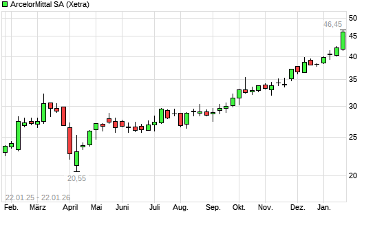 Mit dem Anstieg auf 43,70 EUR hat die ArcelorMittal-Aktie (ISIN LU1598757687) am 21.01.2026 ein neues 10-Jahres-Hoch erreicht und damit den Kurs vom 19.01.2026 eingestellt.