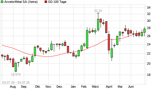Mit dem Anstieg auf 27,63 EUR hat die ArcelorMittal-Aktie am 02.07.2025 die 100-Tage-Linie nach oben gekreuzt.