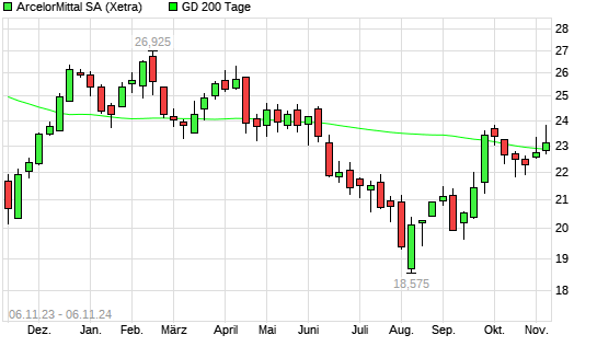 Mit dem Anstieg auf 22,90 EUR hat die ArcelorMittal-Aktie am 05.11.2024 die 200-Tage-Linie nach oben gekreuzt.