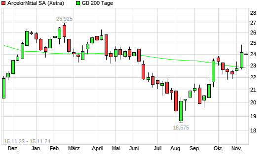 Mit dem Anstieg auf 23,22 EUR hat die ArcelorMittal-Aktie am 14.11.2024 die 200-Tage-Linie nach oben gekreuzt.