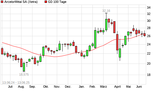 Mit dem Rücksetzer auf 26,30 EUR hat die ArcelorMittal-Aktie am 12.06.2025 die 100-Tage-Linie nach unten gekreuzt.