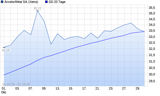 Mit dem Rücksetzer auf 32,90 EUR hat die ArcelorMittal-Aktie am 30.10.2025 die 20-Tage-Linie nach unten gekreuzt.