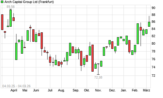 Mit dem Anstieg auf 87,66 EUR hat die Arch Capital Group-Aktie (ISIN BMG0450A1053) am 03.03.2026 ein neues 6-Monats-Hoch erreicht und damit den Kurs vom 09.02.2026 eingestellt.Die ...weiterlesen