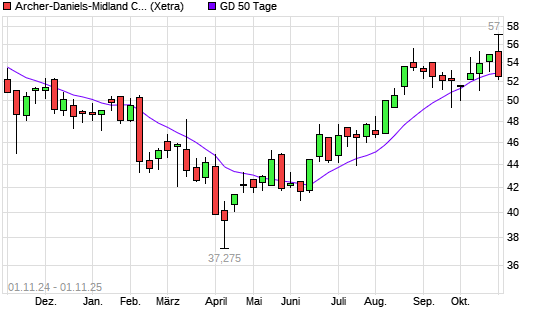 Mit dem Rücksetzer auf 52,55 EUR hat die Archer-Daniels-Midland-Aktie am 31.10.2025 die 50-Tage-Linie nach unten gekreuzt.