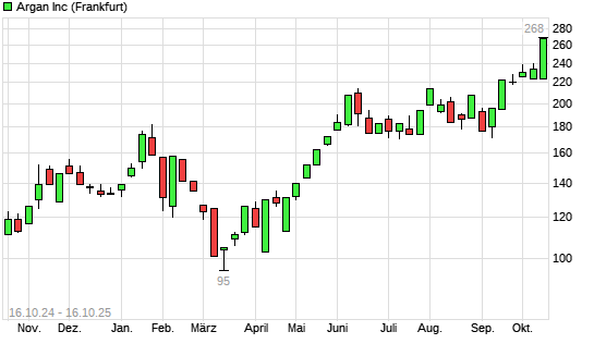 Mit dem Anstieg auf 258,00 EUR hat die Argan-Aktie (ISIN US04010E1091) am 15.10.2025 ein neues All-Time-High erreicht und damit den Kurs vom 14.10.2025 eingestellt.