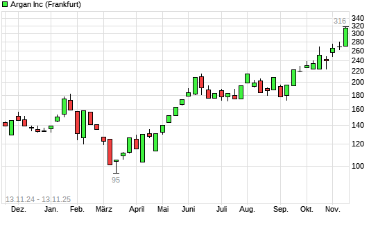 Mit dem Anstieg auf 316,00 EUR hat die Argan-Aktie (ISIN US04010E1091) am 12.11.2025 ein neues All-Time-High erreicht und damit den Kurs vom 10.11.2025 eingestellt.