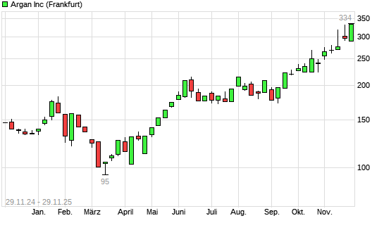 Mit dem Anstieg auf 334,00 EUR hat die Argan-Aktie (ISIN US04010E1091) am 28.11.2025 ein neues All-Time-High erreicht und damit den Kurs vom 27.11.2025 eingestellt.