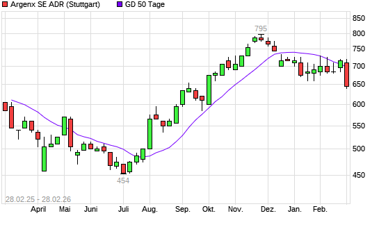 Mit dem Rücksetzer auf 650,00 EUR hat die Argenx ADR-Aktie am 27.02.2026 die 50-Tage-Linie nach unten gekreuzt.