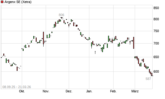 Mit dem Rücksetzer auf 592,60 EUR hat die Argenx-Aktie (ISIN NL0010832176) am 20.03.2026 ein neues 6-Monats-Tief erreicht und damit den Kurs vom 19.03.2026 eingestellt.