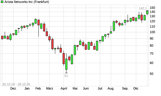 Mit dem Anstieg auf 139,04 EUR hat die Arista Networks-Aktie (ISIN US0404132054) am 29.10.2025 ein neues All-Time-High erreicht und damit den Kurs vom 09.10.2025 eingestellt.