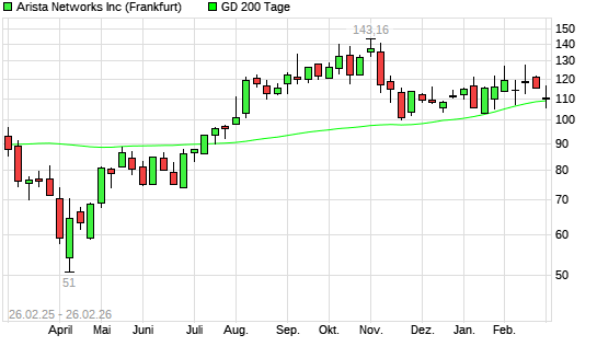 Mit dem Anstieg auf 109,56 EUR hat die Arista Networks-Aktie am 25.02.2026 die 200-Tage-Linie nach oben gekreuzt.