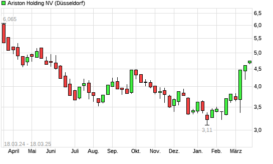 Mit dem Anstieg auf 4,73 EUR hat die Ariston-Aktie (ISIN NL0015000N33) am 17.03.2025 ein neues 6-Monats-Hoch erreicht und damit den Kurs vom 14.03.2025 eingestellt.