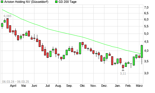 Mit dem Anstieg auf 4,26 EUR hat die Ariston-Aktie am 05.03.2025 die 200-Tage-Linie nach oben gekreuzt.