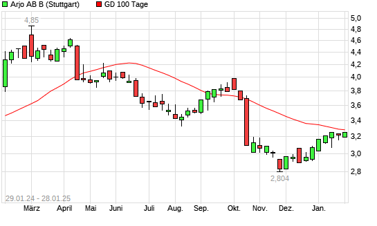 Mit dem Rücksetzer auf 3,16 EUR hat die Arjo-Aktie am 27.01.2025 die 100-Tage-Linie nach unten gekreuzt.