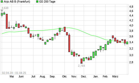 Mit dem Rücksetzer auf 3,35 EUR hat die Arjo-Aktie am 31.03.2025 die 200-Tage-Linie nach unten gekreuzt.