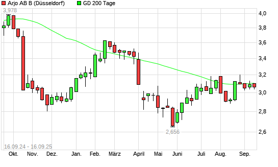 Mit dem Rücksetzer auf 3,08 EUR hat die Arjo-Aktie am 15.09.2025 die 200-Tage-Linie nach unten gekreuzt.
