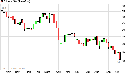 Mit dem Rücksetzer auf 52,60 EUR hat die Arkema-Aktie (ISIN FR0010313833) am 07.10.2025 ein neues 5-Jahres-Tief erreicht und damit den Kurs vom 06.10.2025 eingestellt.
