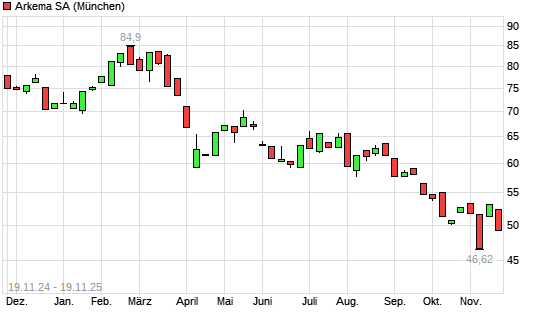 Mit dem Rücksetzer auf 48,74 EUR hat die Arkema-Aktie (ISIN FR0010313833) am 18.11.2025 ein neues 5-Jahres-Tief erreicht und damit den Kurs vom 05.11.2025 eingestellt.
