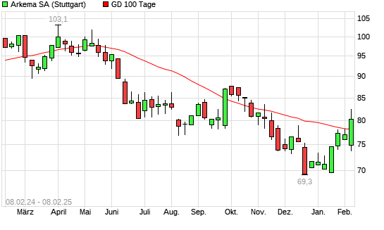 Mit dem Anstieg auf 79,80 EUR hat die Arkema-Aktie am 07.02.2025 die 100-Tage-Linie nach oben gekreuzt.