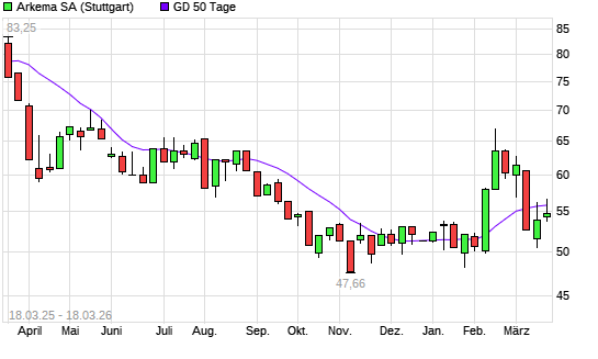 Mit dem Anstieg auf 55,95 EUR hat die Arkema-Aktie am 17.03.2026 die 50-Tage-Linie nach oben gekreuzt.