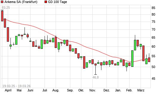 Mit dem Rücksetzer auf 52,50 EUR hat die Arkema-Aktie am 18.03.2026 die 100-Tage-Linie nach unten gekreuzt.