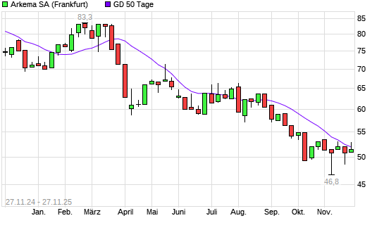Mit dem Rücksetzer auf 51,55 EUR hat die Arkema-Aktie am 26.11.2025 die 50-Tage-Linie nach unten gekreuzt.