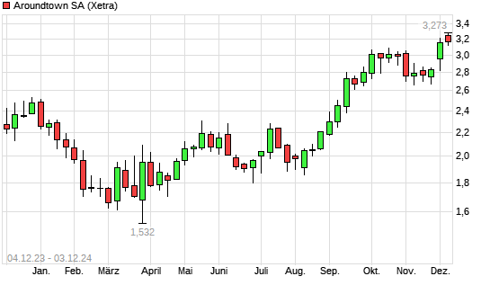 Mit dem Anstieg auf 3,20 EUR hat die Aroundtown-Aktie (ISIN LU1673108939) am 02.12.2024 ein neues 12-Monats-Hoch erreicht und damit den Kurs vom 29.11.2024 eingestellt.
