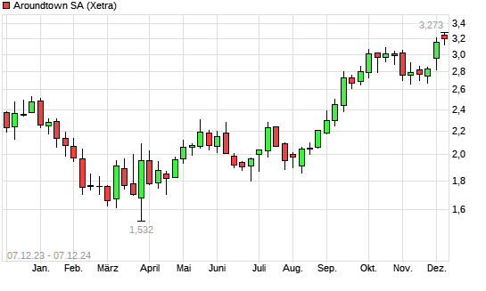 Mit dem Anstieg auf 3,21 EUR hat die Aroundtown-Aktie (ISIN LU1673108939) am 06.12.2024 ein neues 12-Monats-Hoch erreicht und damit den Kurs vom 05.12.2024 eingestellt.