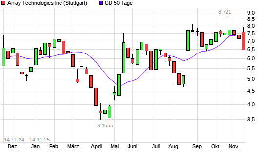 Mit dem Rücksetzer auf 7,20 EUR hat die Array Technologies-Aktie am 13.11.2025 die 50-Tage-Linie nach unten gekreuzt.