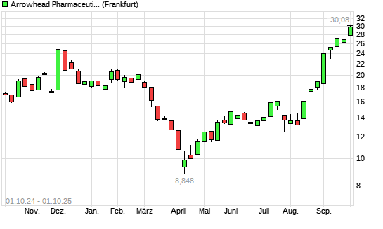 Mit dem Anstieg auf 28,97 EUR hat die Arrowhead Pharmaceuticals-Aktie (ISIN US04280A1007) am 30.09.2025 ein neues 12-Monats-Hoch erreicht und damit den Kurs vom 24.09.2025 eingestellt.