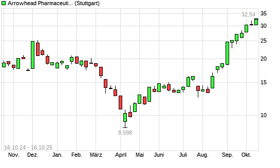 Mit dem Anstieg auf 32,66 EUR hat die Arrowhead Pharmaceuticals-Aktie (ISIN US04280A1007) am 15.10.2025 ein neues 12-Monats-Hoch erreicht und damit den Kurs vom 06.10.2025 eingestellt.