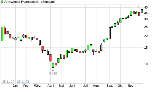Mit dem Anstieg auf 38,48 EUR hat die Arrowhead Pharmaceuticals-Aktie (ISIN US04280A1007) am 24.11.2025 ein neues 3-Jahres-Hoch erreicht und damit den Kurs vom 03.01.2023 eingestellt.