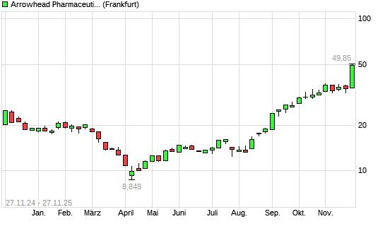 Mit dem Anstieg auf 49,80 EUR hat die Arrowhead Pharmaceuticals-Aktie (ISIN US04280A1007) am 26.11.2025 ein neues 3-Jahres-Hoch erreicht und damit den Kurs vom 25.11.2025 eingestellt.