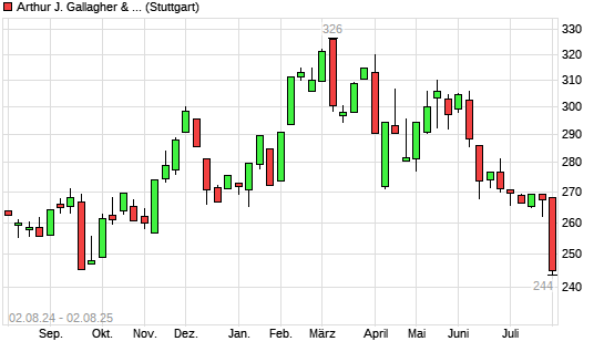 Mit dem Rücksetzer auf 245,00 EUR hat die Arthur J. Gallagher-Aktie (ISIN US3635761097) am 01.08.2025 ein neues 12-Monats-Tief erreicht und damit den Kurs vom 27.09.2024 eingestellt.