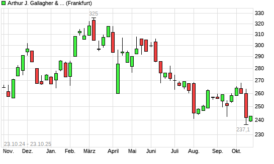 Mit dem Rücksetzer auf 239,40 EUR hat die Arthur J. Gallagher-Aktie (ISIN US3635761097) am 22.10.2025 ein neues 12-Monats-Tief erreicht und damit den Kurs vom 21.10.2025 eingestellt.