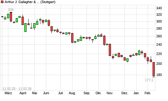Mit dem Rücksetzer auf 177,95 EUR hat die Arthur J. Gallagher-Aktie (ISIN US3635761097) am 10.02.2026 ein neues 12-Monats-Tief erreicht und damit den Kurs vom 09.02.2026 eingestellt.