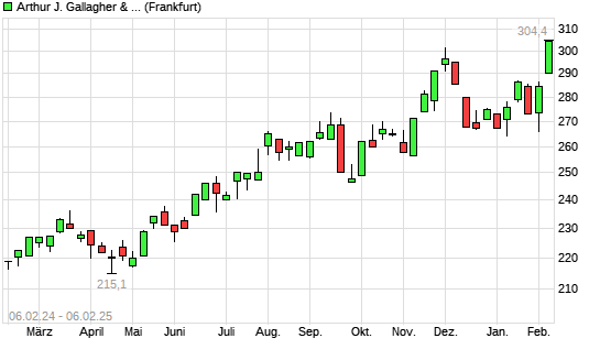 Mit dem Anstieg auf 303,60 EUR hat die Arthur J. Gallagher-Aktie (ISIN US3635761097) am 05.02.2025 ein neues All-Time-High erreicht und damit den Kurs vom 28.11.2024 eingestellt.
