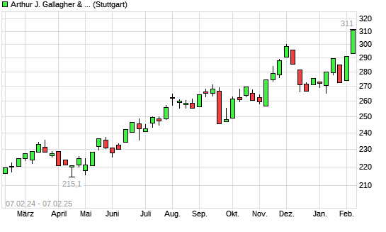Mit dem Anstieg auf 304,40 EUR hat die Arthur J. Gallagher-Aktie (ISIN US3635761097) am 06.02.2025 ein neues All-Time-High erreicht und damit den Kurs vom 05.02.2025 eingestellt.