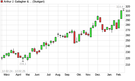 Mit dem Anstieg auf 313,60 EUR hat die Arthur J. Gallagher-Aktie (ISIN US3635761097) am 11.02.2025 ein neues All-Time-High erreicht und damit den Kurs vom 10.02.2025 eingestellt.