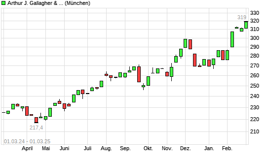 Mit dem Anstieg auf 317,90 EUR hat die Arthur J. Gallagher-Aktie (ISIN US3635761097) am 28.02.2025 ein neues All-Time-High erreicht und damit den Kurs vom 20.02.2025 eingestellt.