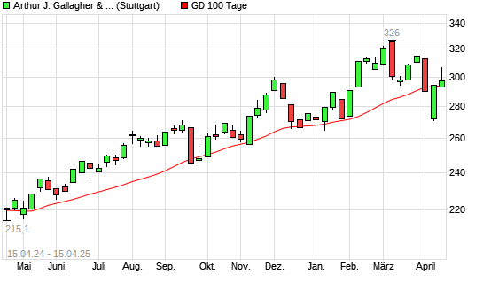 Mit dem Anstieg auf 300,00 EUR hat die Arthur J. Gallagher-Aktie am 14.04.2025 die 100-Tage-Linie nach oben gekreuzt.