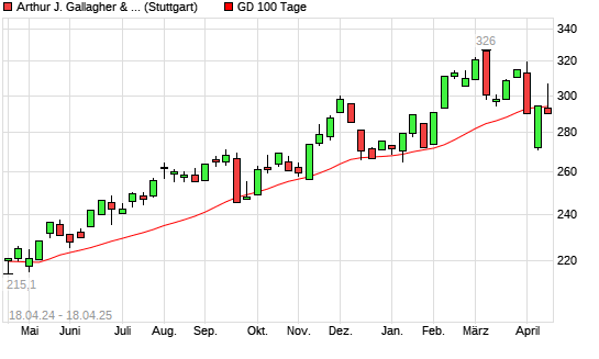 Mit dem Anstieg auf 294,20 EUR hat die Arthur J. Gallagher-Aktie am 17.04.2025 die 100-Tage-Linie nach oben gekreuzt.