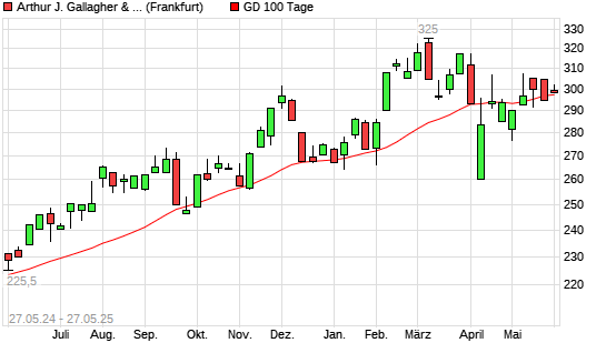 Mit dem Anstieg auf 302,40 EUR hat die Arthur J. Gallagher-Aktie am 26.05.2025 die 100-Tage-Linie nach oben gekreuzt.