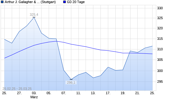 Mit dem Anstieg auf 313,90 EUR hat die Arthur J. Gallagher-Aktie am 24.03.2025 die 20-Tage-Linie nach oben gekreuzt.