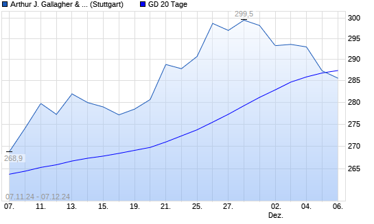 Mit dem Rücksetzer auf 285,50 EUR hat die Arthur J. Gallagher-Aktie am 06.12.2024 die 20-Tage-Linie nach unten gekreuzt.