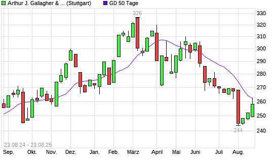 Mit dem Rücksetzer auf 262,10 EUR hat die Arthur J. Gallagher-Aktie am 22.08.2025 die 50-Tage-Linie nach unten gekreuzt.