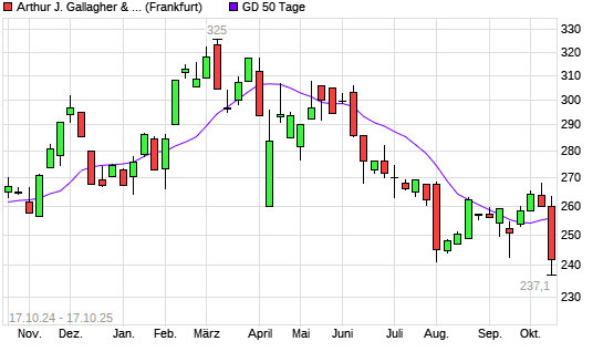 Mit dem Rücksetzer auf 245,30 EUR hat die Arthur J. Gallagher-Aktie am 16.10.2025 die 50-Tage-Linie nach unten gekreuzt.