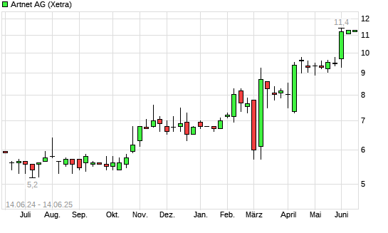 Mit dem Anstieg auf 11,30 EUR hat die Artnet-Aktie (ISIN DE000A1K0375) am 13.06.2025 ein neues 3-Jahres-Hoch erreicht und damit den Kurs vom 12.06.2025 eingestellt.