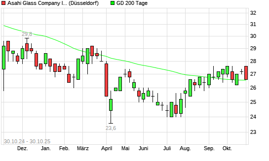 Mit dem Rücksetzer auf 26,80 EUR hat die Asahi Glass Company-Aktie am 29.10.2025 die 200-Tage-Linie nach unten gekreuzt.