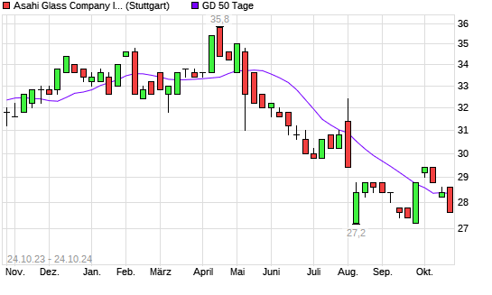 Mit dem Rücksetzer auf 27,80 EUR hat die Asahi Glass Company-Aktie am 23.10.2024 die 50-Tage-Linie nach unten gekreuzt.
